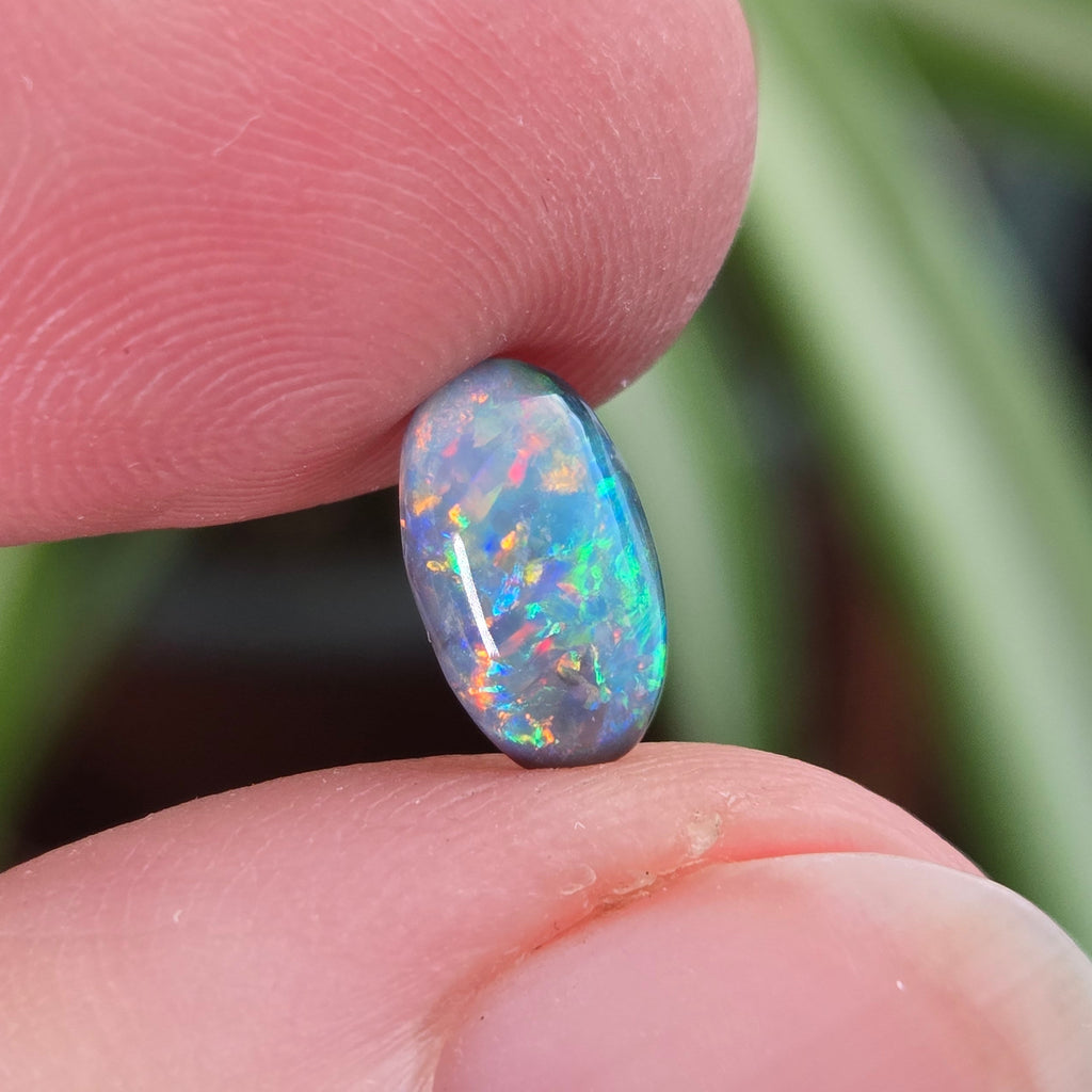 An incredible bright colour combination in this dark Australian opal from Lighting Ridge. It has a high dome and an elegant elongated shape what will look incredible in a ring.